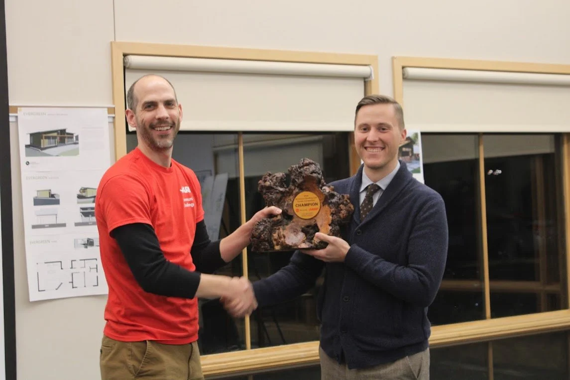 Jacob Bielanski, of Van Cleave Architecture + Design, receives the ADU Design Challenge trophy as the overall winner. The award is presented by Lewis Kuhlman, from the City of La Crosse